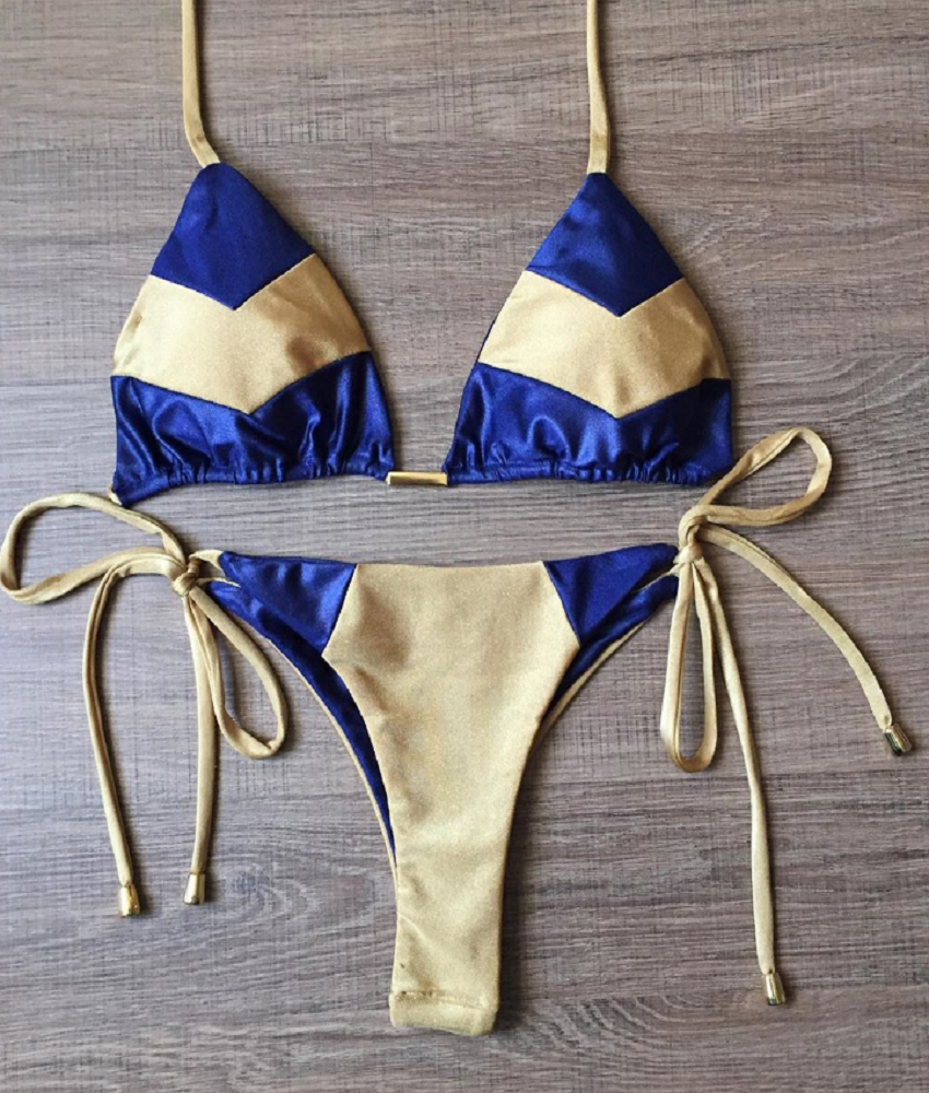 Adereços em dourado nas ponteiras da calcinha e no top, que não esquentam ao sol