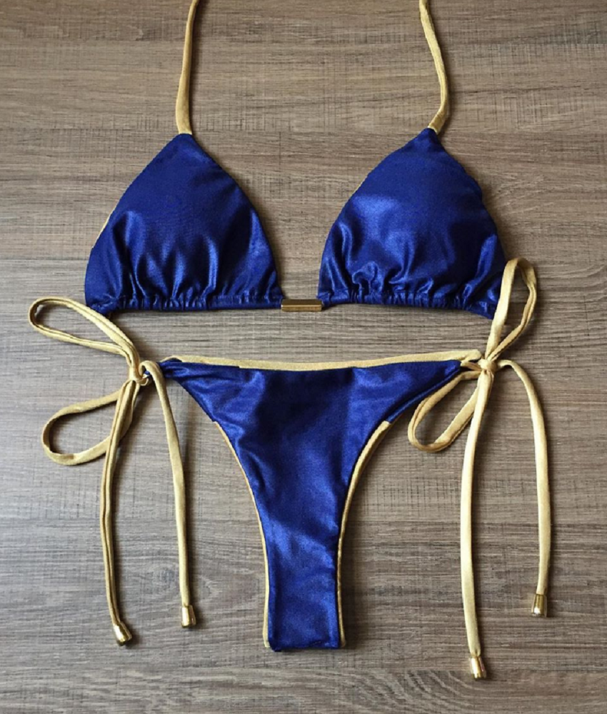 O Biquíni Perolado Dourado e Azul Marinho traz um toque de elegância e riqueza. O dourado desse biquíni vai fazer você brilhar ainda mais. O Esse biquíni é ideal para quem adora um fio dental, estar cheio de estilo e ainda ter mais de um biquíni na mesma viagem, porque por ser dupla face, o biquíni pode ser usado de 4 formas diferentes. Use sua imaginação e brinque com as combinação das cores. O outro lado do biquíni é todo em azul marinho.